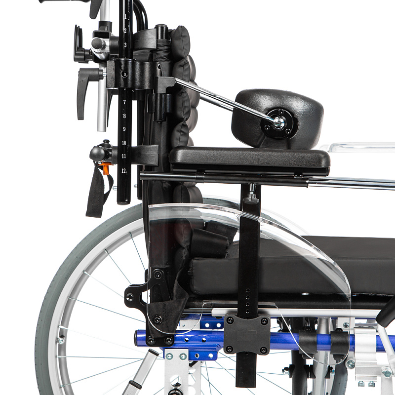 Подголовник и боковые поддержки коляски регулируются по вертикали, горизонтали, углу наклона и обхвату головы, обеспечивая надежную фиксацию и поддержку. Это помогает предотвратить деформации грудной клетки и позвоночника, а также улучшает постуральный баланс. Съемный столик служит дополнительной опорой для верхней части тела, что особенно полезно во время приема пищи.